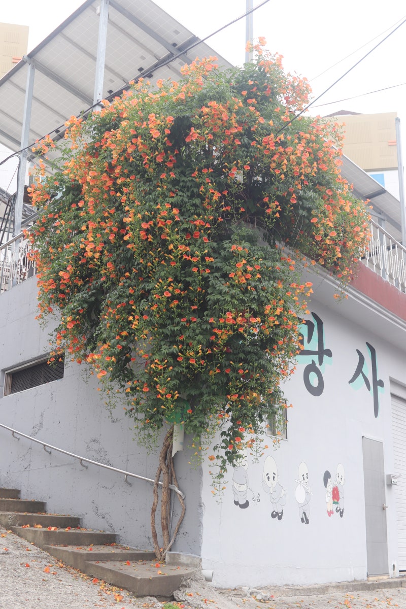 보광사 옆에 위치한 ‘능소길 골목’은 최근 몇 년 사이 거제의 숨은 명소로 떠오르기 시작했습니다. 원래는 평범한 골목이었으나, 보광사 담벼락을 따라 심어진 능소화가 해마다 화려하게 피어나면서 SNS와 블로그를 통해 입소문이 나기 시작했습니다. 특히 여름철이면 이 골목은 능소화의 주황빛 꽃으로 가득 차, 마치 동화 속 한 장면 같은 풍경을 연출합니다. 지역 주민들은 물론, 인근 도시에서 일부러 찾아오는 관광객들도 점점 늘고 있습니다.